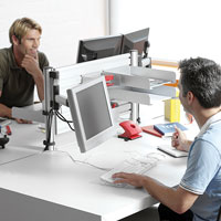 | TSS Rails are perfect for separating call centers and providing efficient use of very tight spaces. | TSS Rails provide monitor support, privacy and a clean workstation environment. | Using the Rail Mount Monitor Arm, many seats can be configured in only a small area such as a classroom. |
