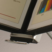 | Desk clamp attaches ReachFile to any surface up to 2" thick while taking up zero desk space. | Chrome handle enables display panels to be positioned at the optimum viewing angle. Panels and base rotate independently of each other. | Dry Erase Panel/Copyholder to write quick notes or messages with included pen and eraser has pockets to keep photos or use it as a copyholder. |