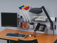 | Walmaster lifts items that typically take up all of your work area off your desk. Mount your LCD monitor, a lamp or any of the other available items. | A wide variety of hook-on accessories keep current files, supplies, media and frequently referenced materials in full view, organized and close at hand. |