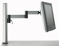 Axcess Duo Monitor Arms For a more cost effective alternative to the TSS (Tetra Support System), The DSS (Duo Support System) provides a two channel system for dual monitor, rail and slatwall systems. The patented steel lever locking system enables you to quickly adjust screen height and a ball and socket joint lets you swivel a full 90° in all directions. Built-in cable management keeps cords and wires neat and out of the way. All mounting options come with a 17" DSS post unless otherwise specified. Arms are VESA 75 and 100 compatible and have a total reach of 16" when fully extended.