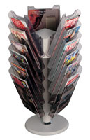 Axcess Rotary Displays Cascading Rotary Displays provide the most display pockets in the least amount of space. Pockets are constructed from clear acrylic with light gray stands to accent any office decor. Desktop rotary units turn easily atop the base, and floor rotary units have independent revolving racks that turn a full 360 degrees. Display your magazines or literature with our cascading designs. The top quarter of each magazine remains exposed, which is all that is necessary for quick identification. The overlapping cascading design is ideal for offices, lobbies, and waiting rooms with limited space, or for those that need to display a wide assortment of literature.