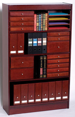 Axcess WoodWorx™ Bookcase Organizers Turn ordinary shelving into custom storage systems. WoodWorx components were specifically designed to fit into standard bookshelves. Stack Letter Trays, Supply Drawers or Media Drawers in any combination to store forms, literature, supplies and media on your existing shelving. All models are constructed from durable MDF, laminated with a genuine wood veneer, and finished in your choice of four elegant stains: cherry, mahogany, medium oak or black.